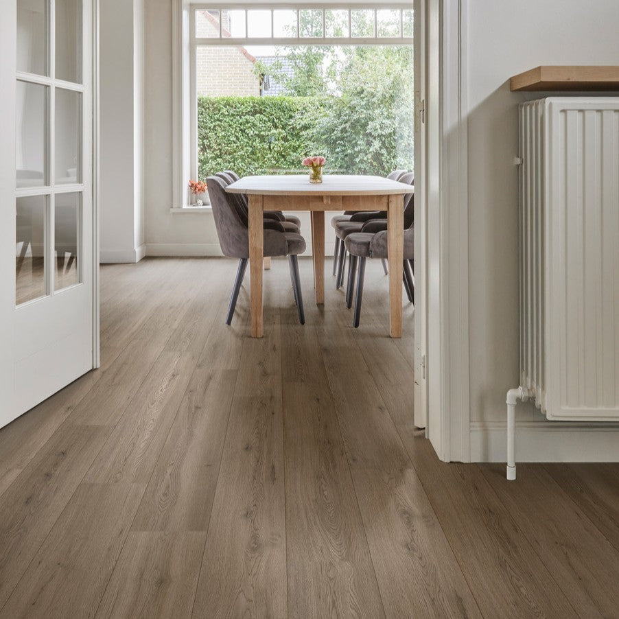 Mit COREtec Eiche Cleveland Oak bringst du natürliche Eleganz und wohnliche Wärme in dein Zuhause. Die realistische 3D-Strukturprägung verleiht der Oberfläche eine authentische Holzoptik – kaum von echtem Parkett zu unterscheiden.
